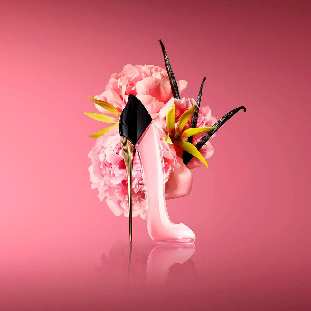 Ce lancement de la ligne iconique Good Girl révèle les multiples facettes de la féminité moderne, avec une double dose de vanille, le romantisme pastel des pivoines et de l'eau de rose recyclée.Sensuelle et forte, romantique et puissante, il est bon d'être rose !
