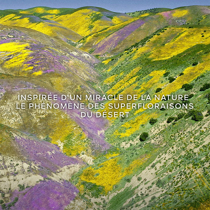 Découvrez Florabloom, l'explosion joyeuse d’un bouquet coloré comme un arc-en-ciel, illuminé en son cœur par une tubéreuse aussi vraie que nature. Autour de cette fleur blanche éblouissante, roses, accords iris et violettes se mêlent sur fond de mousse et révèlent des facettes solaires et onctueuses. Une création inspirée par le spectacle éblouissant des superfloraisons du désert, phénomène naturel rare qui par des pluies intenses, donne vie à un parterre de fleurs aux mille couleurs.