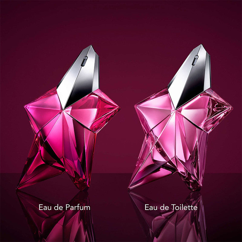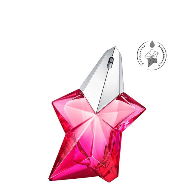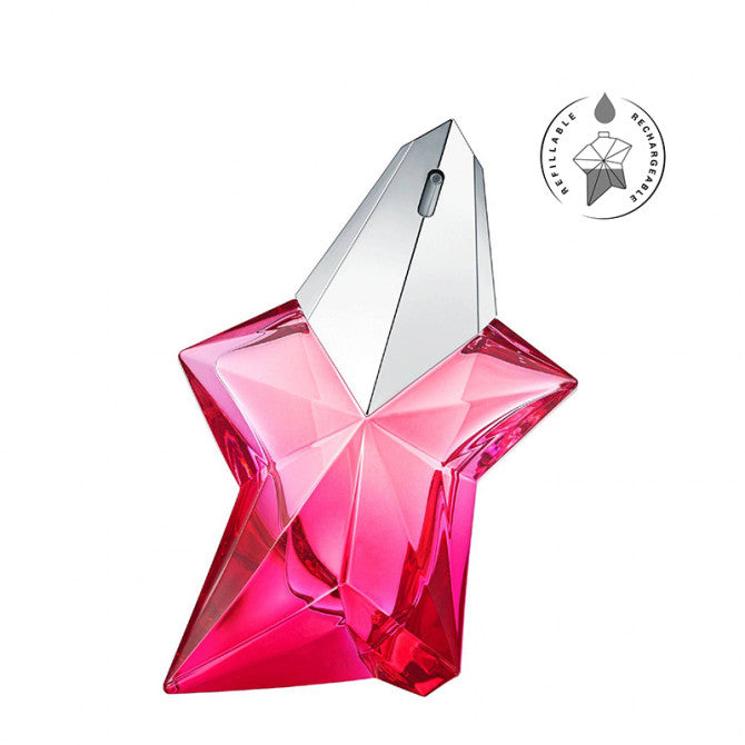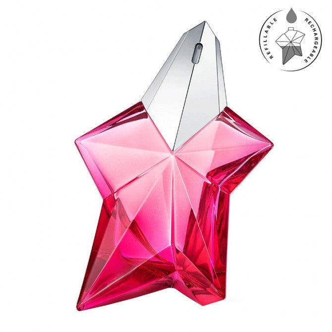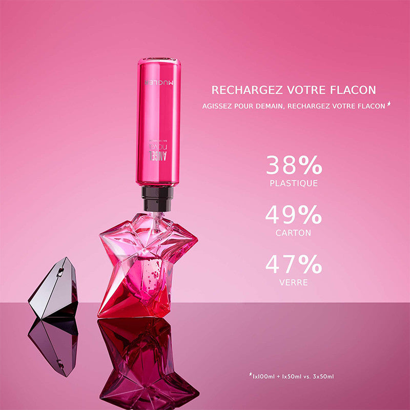 Le flacon étoile iconique se teinte d’une nouvelle lumière : une robe rose framboise dégradé vibrante et lumineuse, qui célèbre l’audace et le désir de réinvention d’Angel NOVA. Ce flacon Etoile est rechargeable à l’infini grâce à son flacon recharge.
