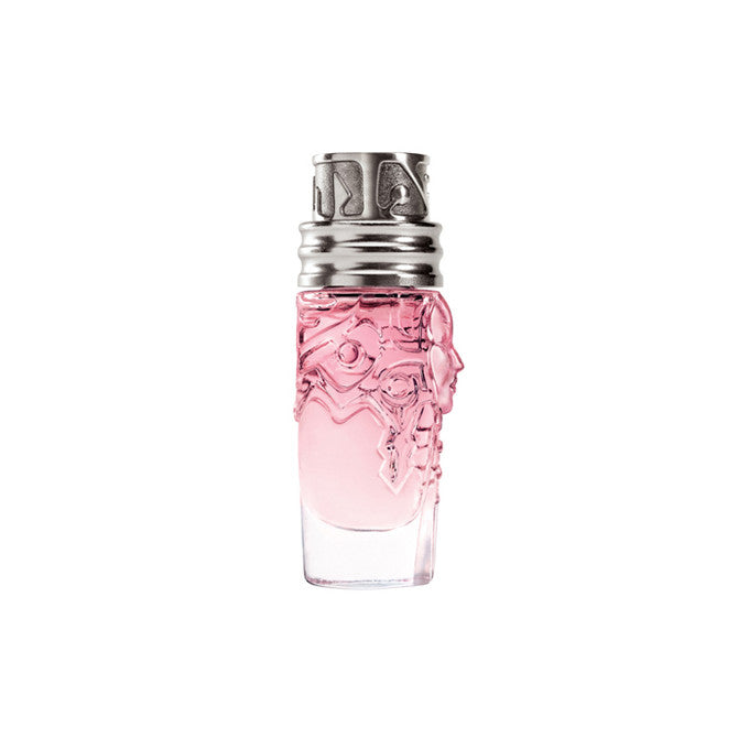 Le flacon, véritable totem de verre gravé, laisse transparaître le jus d'un rose délicat.